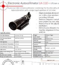 Introducing a cutting-edge USB 3.0 Autocollimator that combines exceptional autocollimation performance with an expansive 110 mm input aperture. Offering high resolution down to 0.01 arc seconds (0.05 µrad) and a clear aperture over 110 mm, this system features a built-in, computer-controlled laser pointer for effortless alignment, as well as integrated Pan & Tilt adjustment mechanics. This hybrid solution seamlessly fuses alignment precision with advanced beam analysis capabilities, setting a new standard in performance.